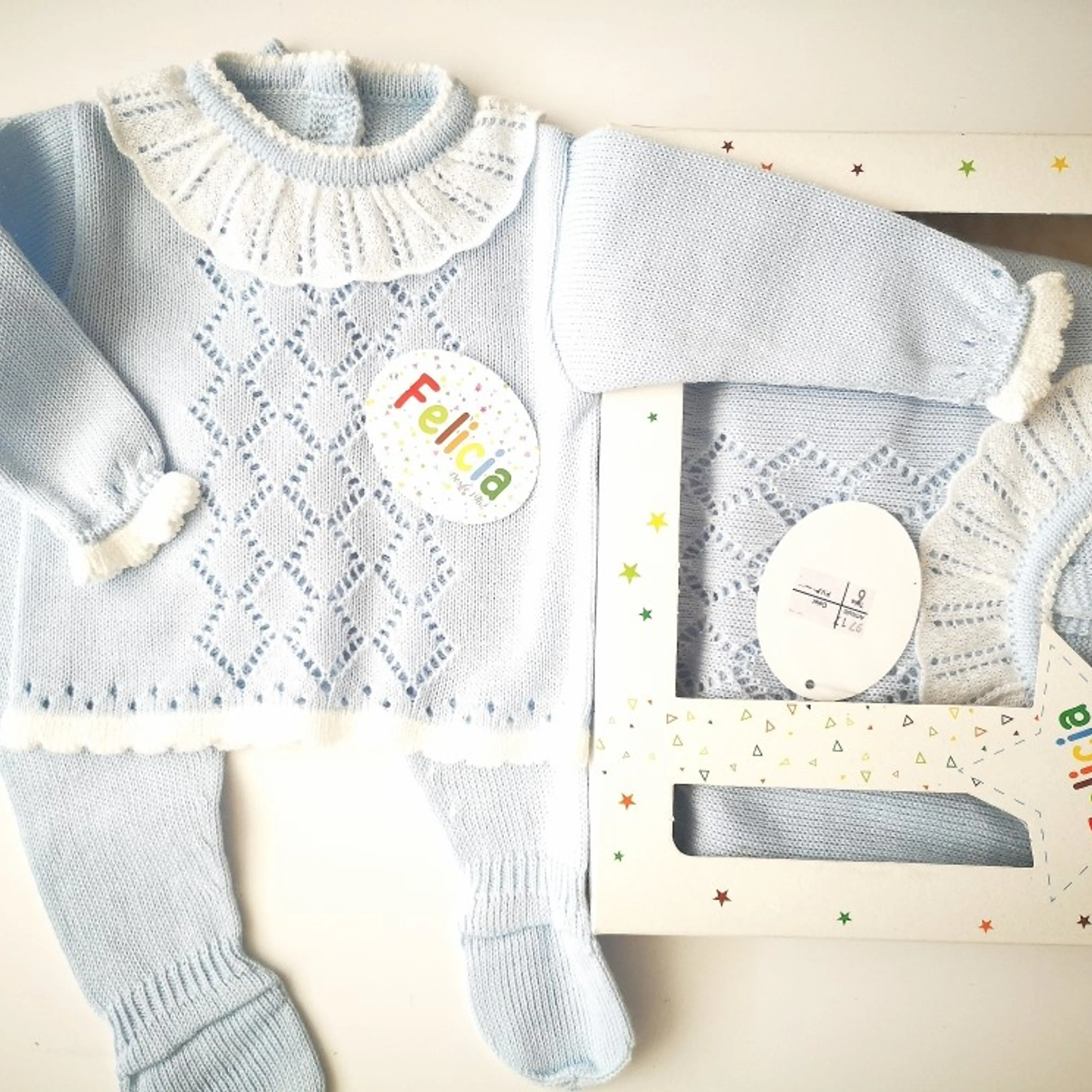 Boxed Spanish Knitted Set 9717-White & Aqua Blanco /Plata This set comes in 4 sizes -0/1/3/6months -so you get one of each size in this pack Made In Spain 100% Dralon Brand : Felicia