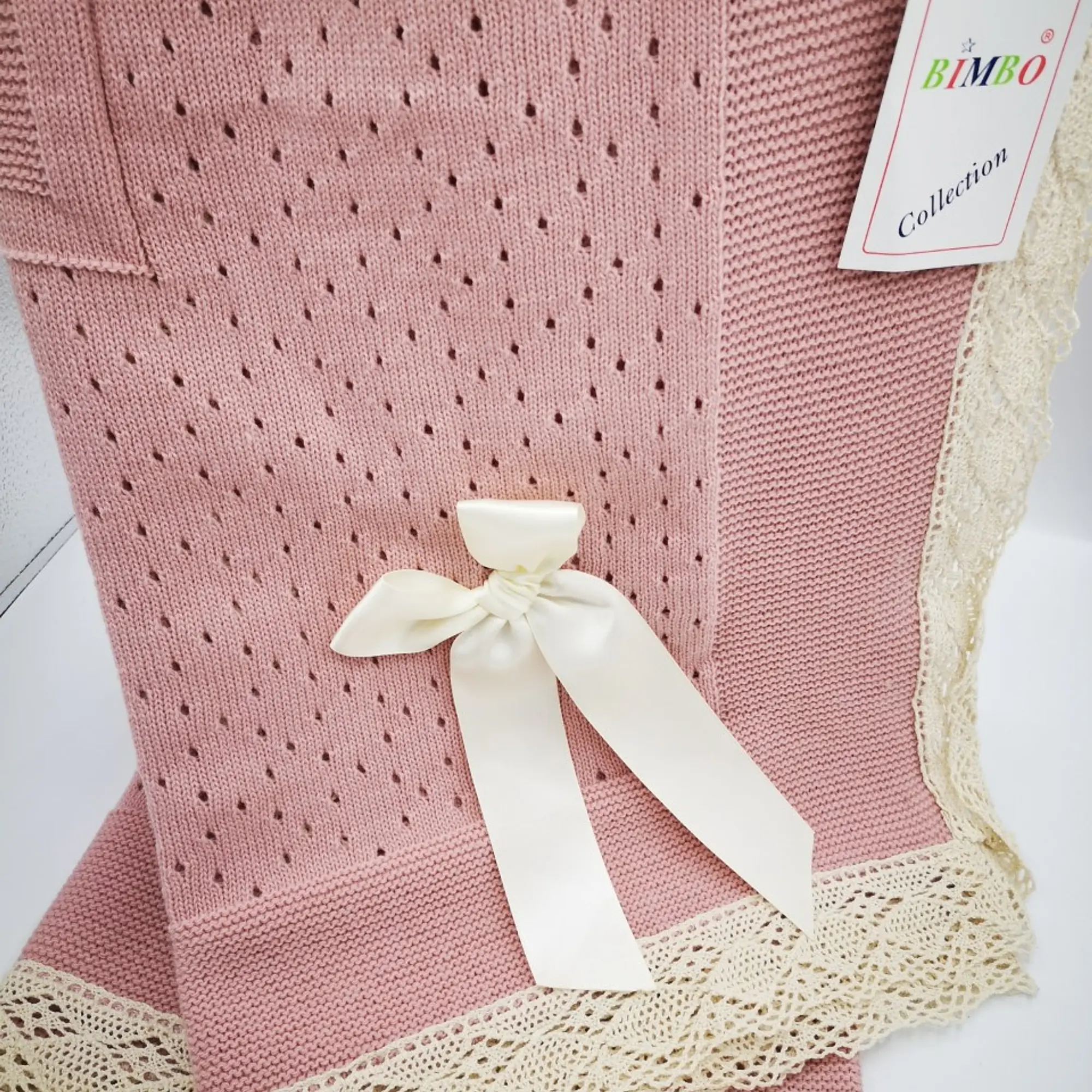 Crochet lace and ribbon shawl Rose Pink Ref 5 Rose Pink shawl with cream crochet lace trim & cream satin bow Ideal for Christenings and outings This shawl measures 120cm x 120cm This item is priced per piece Brand : Bimbo Commodity Code : 61119090
