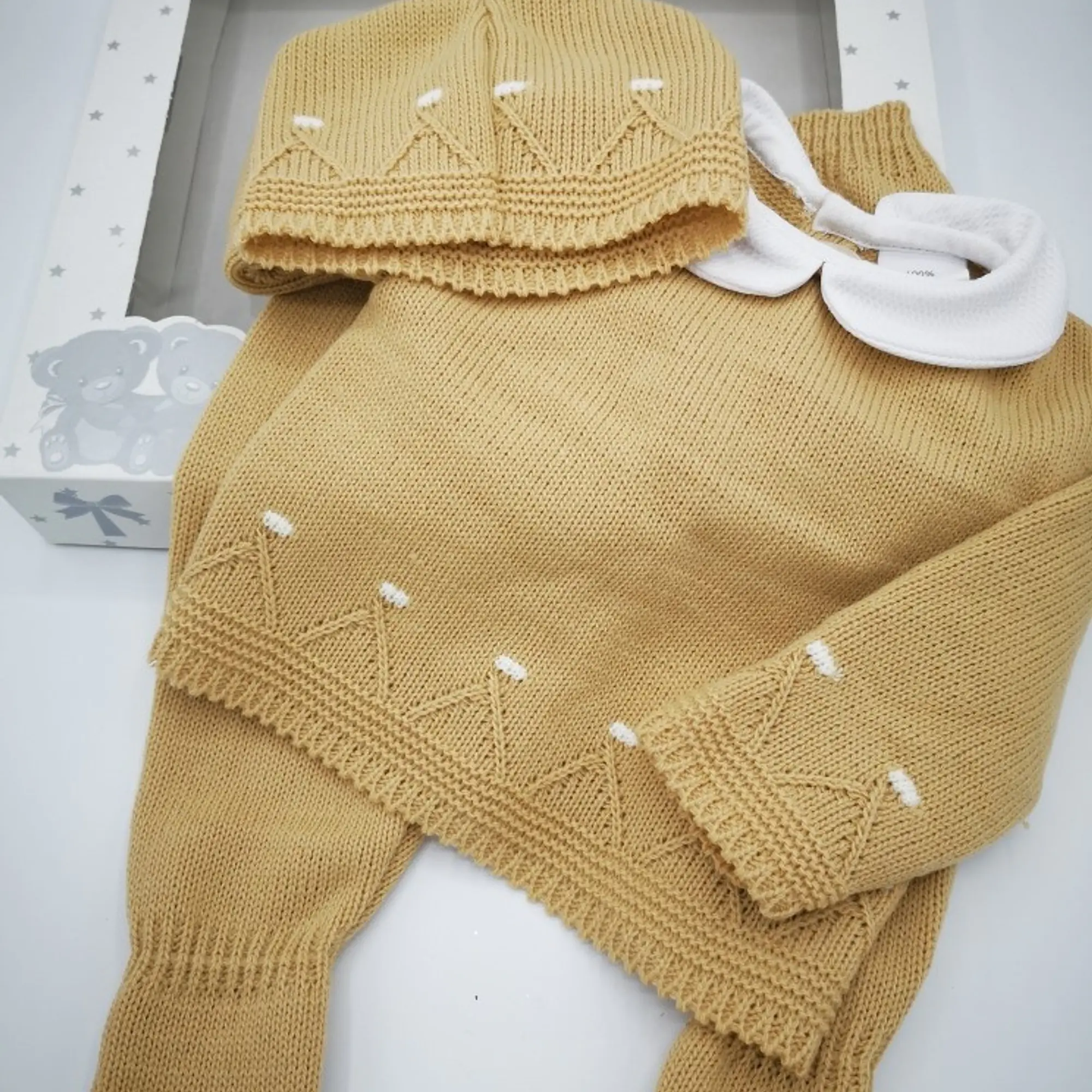 This style comes in a Gift Box and includes a knitted legging / bootees and / jumper & mittens