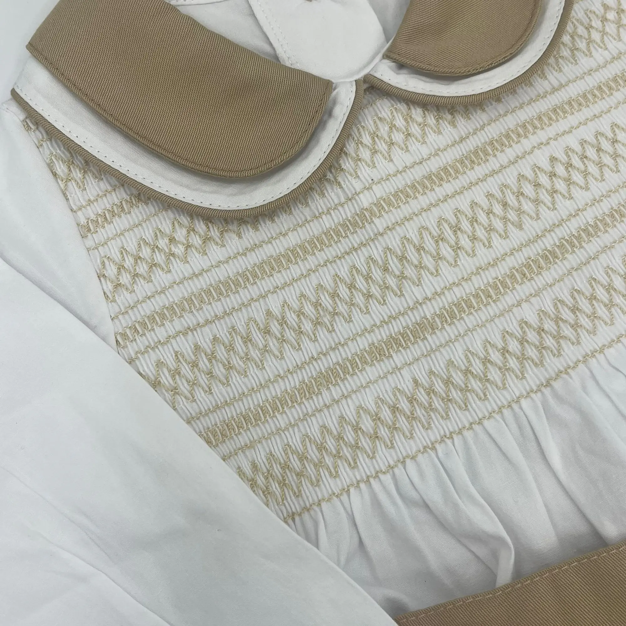 Camel shorts set with white shirt with smock detail in matching thread