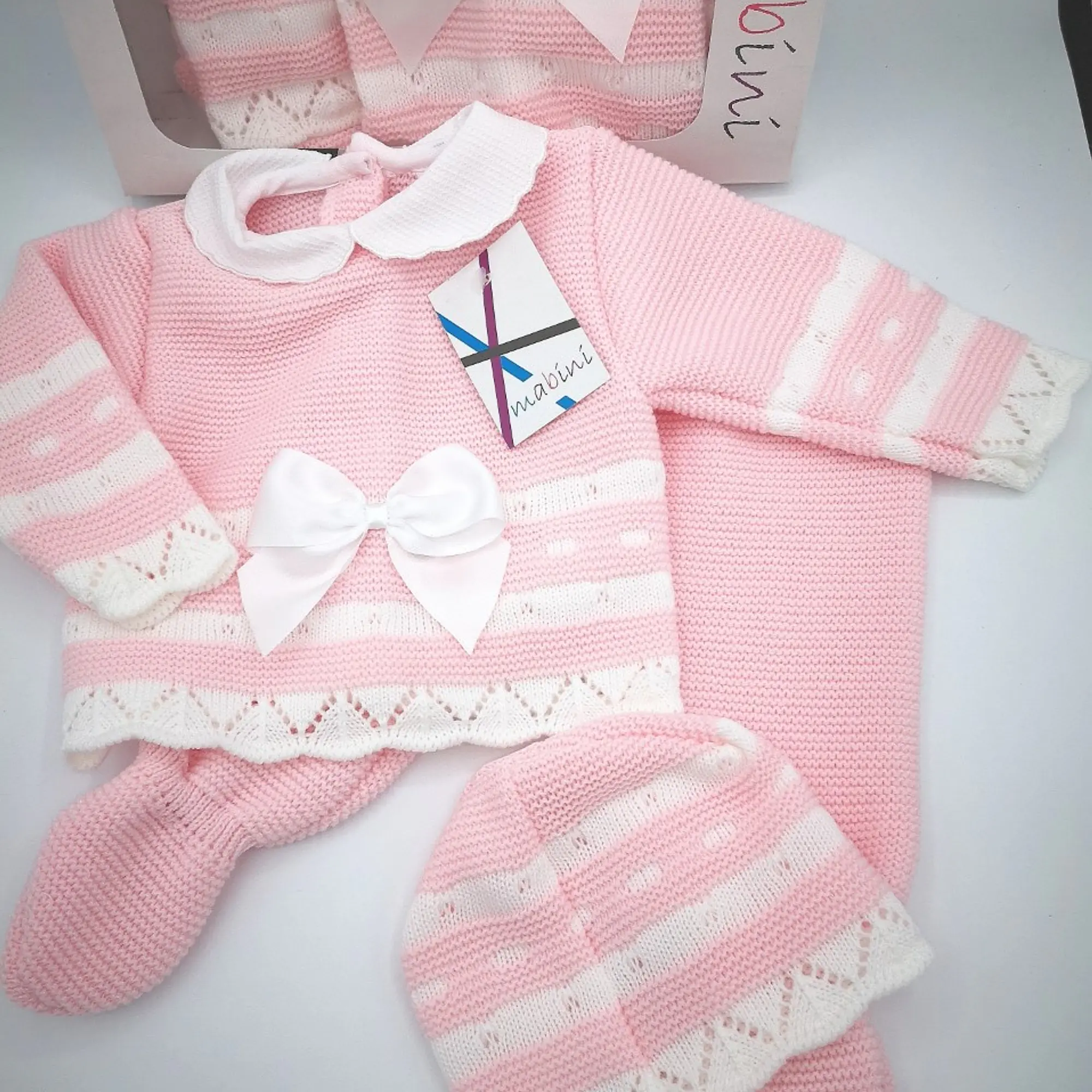 This style comes in a Gift Box and includes a knitted legging / bootees and / jumper & mittens